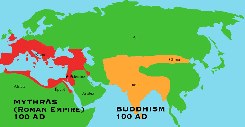 Above -- Tapestry showing Jesus (called "Issa") calming the waters. So what? I mention this here because there is quite a similarity with the actual teachings of Jesus and those of Buddha. I'll get to that in a bit. First, lets get this next part over with so I can tell you something that might not sit well with you. Have a look at this map [below]. It shows where the teachings of Buddha were thriving when Jesus was alive. Because Buddhism evolved from Hinduism, the appeal to cultures around the Mediterranean was nil. Instead, the Roman Empire had its own deity and religion that they endorsed. It was called Mithraism and was centered around a "son of god", the "savior" called Mithras.