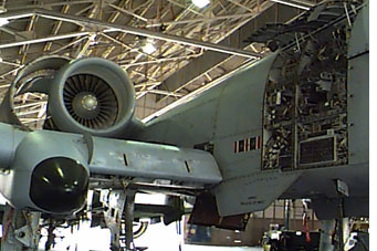 Designed in the late 1970's by Fairchild Republic as the Thunderbolt II, the A-10 is basically a gigantic Gatling gun, occupying most of the fuselage, with seven rotating barrels that shoot bursts of high velocity 30 mm shells - only it can also fly. Powered by twin General Electric engines that deliver up to 9000 pounds of thrust each, the A-10 , although highly maneuverable, is not a fast jet like the more sophisticated, modern fighters and interceptors.