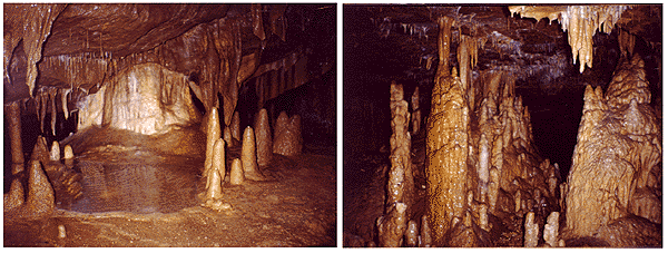 Many caves are formed by subterranean streams that have hollowed out and scoured the rocks for centuries. Minerals, dripping from the ceiling of these caverns, form spiked stalactites, while their deposition on the ground build up pires called stalagmites.