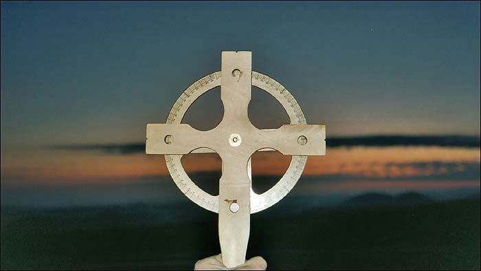 The cross arms are perforated with viewing holes to allow the observer to read the angles. The bottom of the wheel is weighted so that it will always point to the center of the earth.