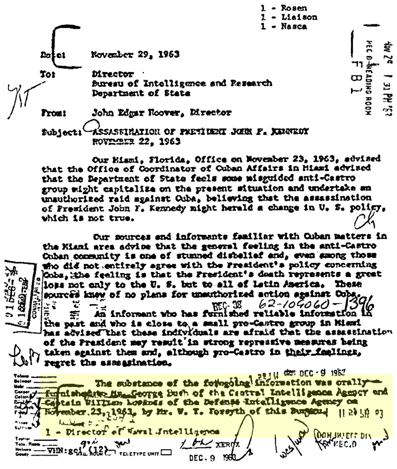In the following memorandum from the J. Edgar Hoover, we see that the information about anti-Cuban activity, which was supposedly the motivation for Oswald, was given verbally to Hoover by none other than George Bush!