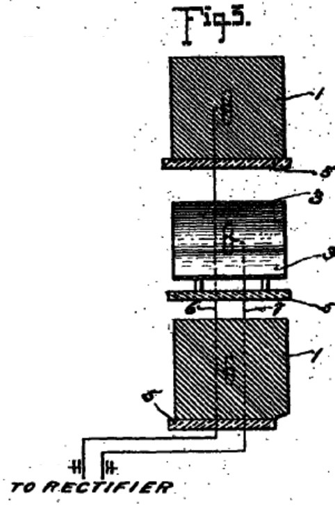 14 and through the rectifier to the electrode 13 and conductor 35 to line