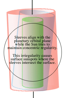 The Sun's axis is tilted 7.25 degrees from the normal to the plane of Earth's orbit. In the 11.861773 year revolution of the Jupiter-Sun barycenter around the Sun, the relative positions of the tilted Sun resemble the equinoxes and solstices on Earth. Because of the great mass of the Sun, the gyroscopic forced produced by Jupiter do not cause it to precess rapidly, but they can supply the energy to create the eddies which appear on the surface of the Sun as spots and flares. The precessional force would be least at the "solar equinoxes," and greater at the "solar solstices." There would be a tendency for the rotating cylinder "sleeves" in the Sun to align themselves with the common axis of the planetary orbits, which would create confusion as the Sun tends to maintain the sleeves concentric with its own axis. However, the problem could likely be solved in a computer, projecting thousands of years into the past and into the future.