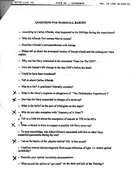 The first step was to set a strategy. He already had the questions. What he needed was definitive proof that Goerman had formulated his hoax theory while ignoring evidence that was in his possession. That would be the William Moore book. To do that he would have to get Goerman to talk. No problem. A basic 'sting-op' procedure. He also wanted to do the same to the Navy's John Reilly, because he needed definitive evidence that nothing the Navy would say about the Philadelphia Experiment would be the truth. After all, if the Philadelphia Experiment did happen, it would still be top secret. They would have to deny it the same way as the Air Force denies the existence of Area 51. In particular, Marshall wanted to prove Reilly's comment of "having no knowledge of such a test," was irrelevant.