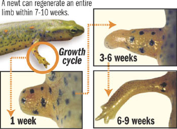 The newt is a small salamander that has been show to regenerate a limb or tail when it is accidentally lost. In laboratory experiments, when a leg is amputated, the wound immediately forms a seal to prevent blood loss. But unlike mammals which form a scar, the newt forms a blastema.