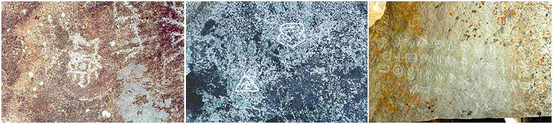 The petroglyphs appear to be chiseled in the rock, unlike the regular pecking you would normally see in Native American petroglyphs. This could be an indication that they are relatively recent and were made with metal tools rather than stone implements. Metal tools were unknown to Native American Indians prior to the 16th Century when the Spanish migrated to the western region of America. Since the symbols appear to be made after this period it is likely that they are not directly related to an ancient language.