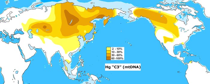 Quite naturally, the highest concentrations (60-100%) of mutation C3 are found along the proposed migration route, in northern Siberia, around Lake Baikal and in the Kamchatka Peninsula (where the Dyuktai Cave archaeological site was dated to 10,000 years ago).