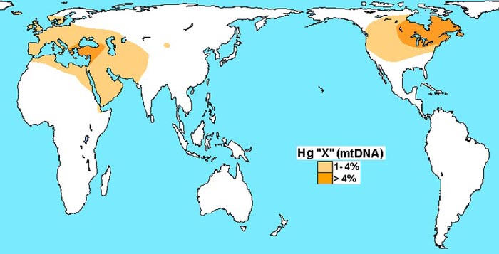 [Above:] Although the global occurrence is very small (less than 4%) the population containing the X mutation appears concentrated in the Algonquin Native American Indian population and in what is now Turkey.