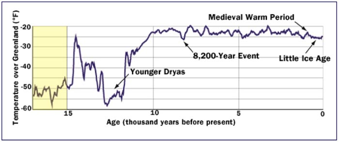 "Paleoclimatological mapping has produced some surprising results. We have long talked about four ice ages. It is now apparent that multiple events during the Pleistocene represented long-term cooling trends, known as Bond cycles, and incorporated many shorter ice advances that alternated with periods of warming. Heinrich events, named for Hartmut Heinrich, were periods when massive amounts of ice calved off glaciers and formed huge packs of icebergs. Although we once thought that creating an ice age took millennia, we now realize that drastic climatic changes can happen extremely rapidly, perhaps even within a few decades." [2]
