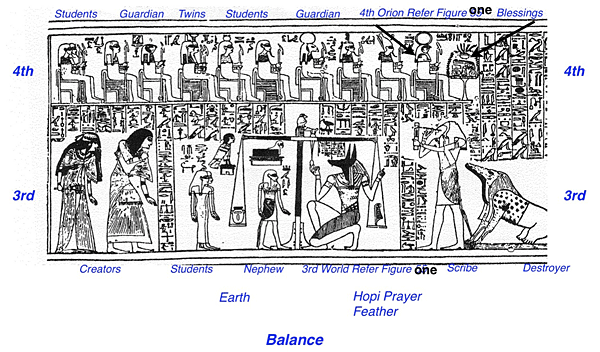 The Dog or Jackal-like figure, representing the 3rd world, is teaching young people about balance. The young Nephew, who is mentioned in the Hopi Creation Story, is on the other side of the balance on the bottom level helping with this teaching.