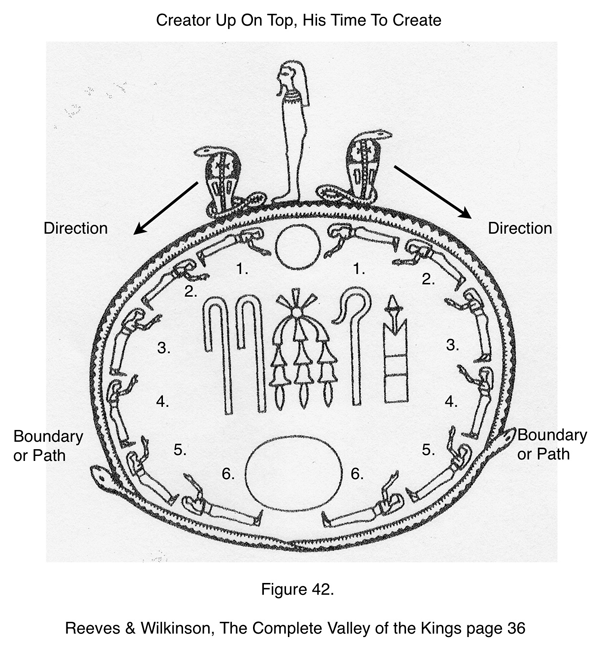 Again the snakes form the boundaries and show the direction the Earth is rotating through the constellations. Each figure in the circle has his arms raised and is praising the Creator. The Creator is up on top, ready to create at this point in time. Whenever I see 12 items on the murals of Egypt I think of the 12 constellations. I am not sure what the symbols in the middle of the circle represent.