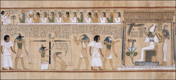 The Egyptologist explanation: The Weighing of the Heart (Spell 308). The deceased and his wife stand at left, in the middle, Anubis weights a heart, representative of the deceased, against a feather, the symbol of Maat ("things as the ought to be"). The god Thoth records the proceedings, while the monster Ammit ("Swallower of the Dead") waits at right to devour the heart if it is found wanting. Above sit twelve gods as witnesses. From the Book of the Dead of Ani.