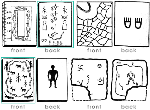 Figures of headless men, swastikas, and snakes. One corner of the Fire Clan Tablet has a corner missing. It was broken off when Masawa gave the stone to the Hopi, and this piece was given to the White Brother as proof that he could return and join in the Ceremonies, finally completing the Cycle making this a paradise on Earth, complete with joyful songs to the Creator from the rooftops. Old Oribia will be rejuvenated and rain will come for all the crops for all four brothers on Mother Earth." [source]